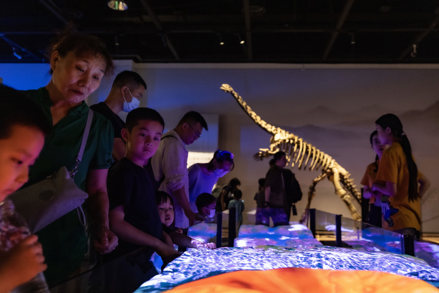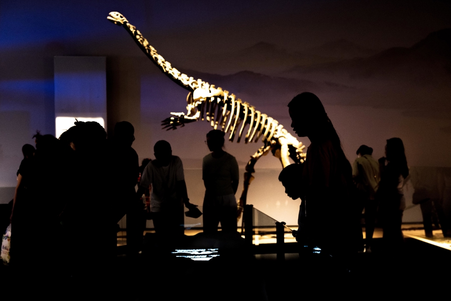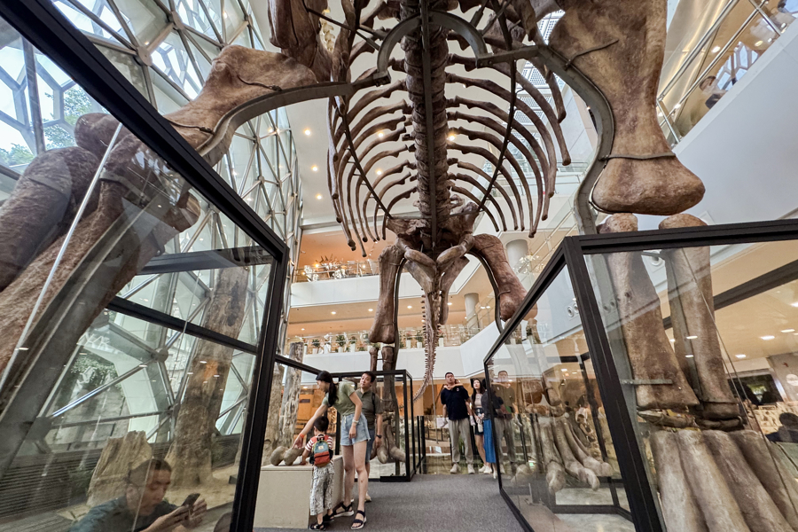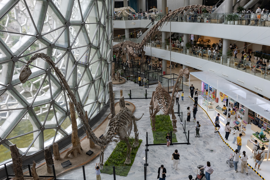 在上海自然博物馆B2中庭,观众从巨型汝阳龙模型下穿越参观。