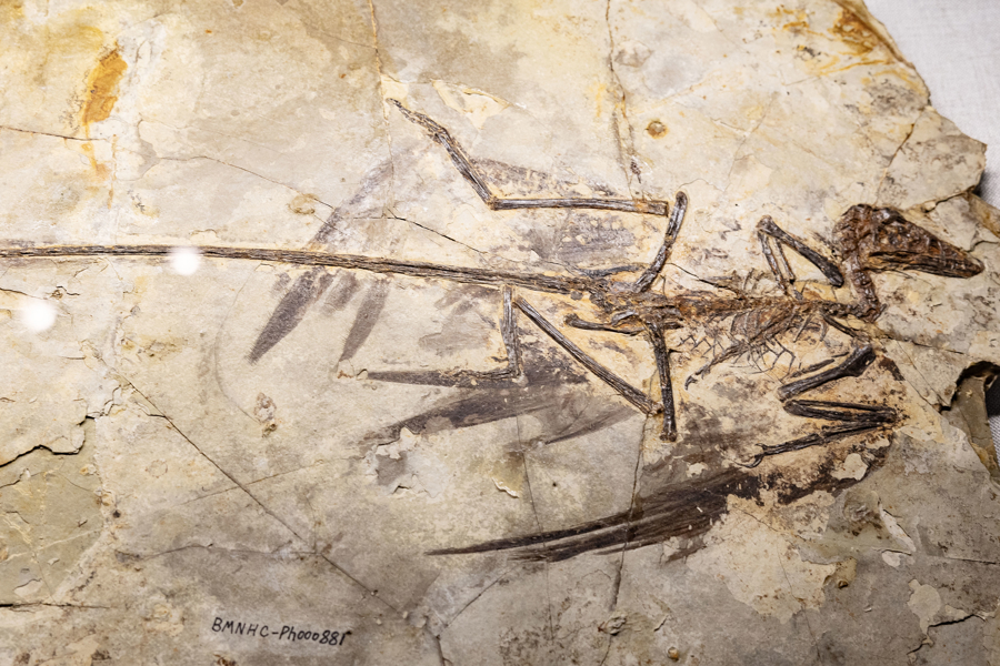 此次展览还试图回答一个关于鸟类演化的重要问题:“恐龙是否真的灭绝了?它是否依然在我们身边?”记者留意到,展览特设了一个名为“飞向蓝天的恐龙”展示区。“在中侏罗世至白垩世期间,小型兽脚恐龙开启了征服蓝天的历程。化石记录显示,这些恐龙身上开始覆盖绒羽、正羽等不同类型的羽毛。”李必成以最早飞向天空的顾氏小盗龙为例:“它演化出了不对称的飞羽,通过主动振翅飞向了蓝天。而另外一支,如长臂混元龙,则选择依靠翼膜进行滑翔,走出了不同的飞行演化路径。这些不同的路径,充实了我们对生物演化的理解,也让我们更加懂得生命演化过程的曲折和艰辛。”