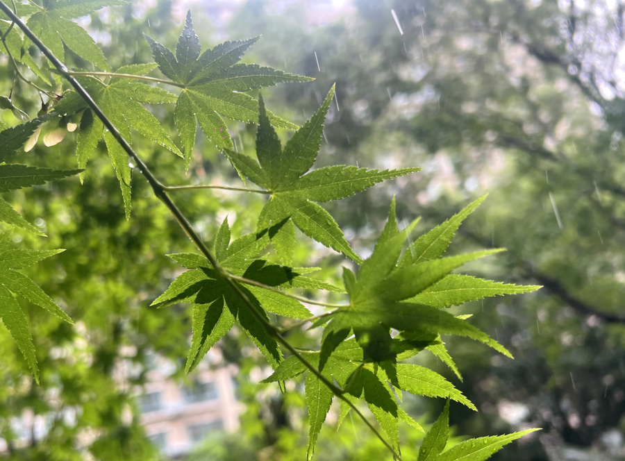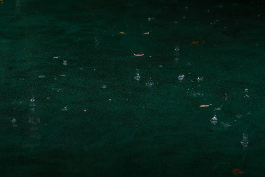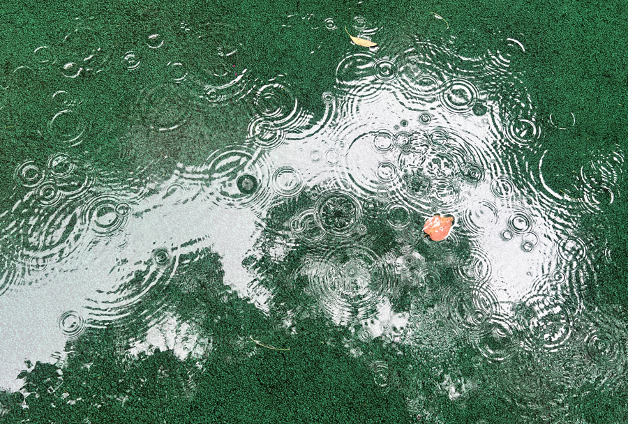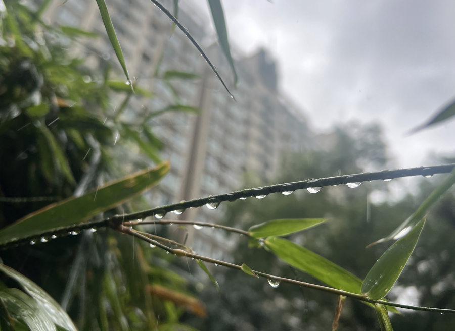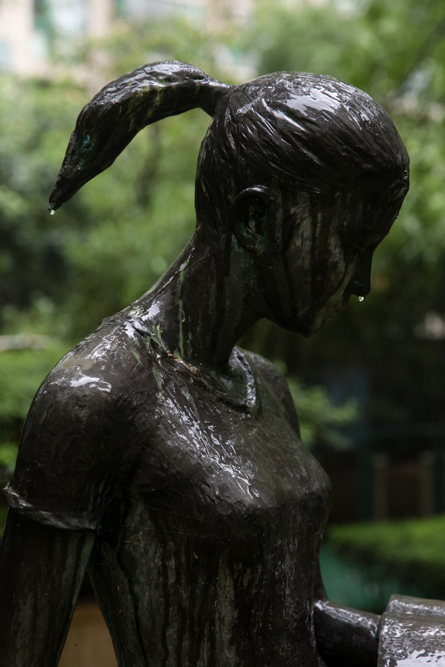 女孩雕塑的发尖和鼻尖也滴着雨珠。