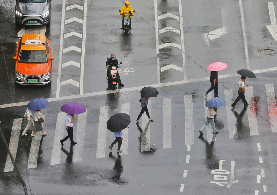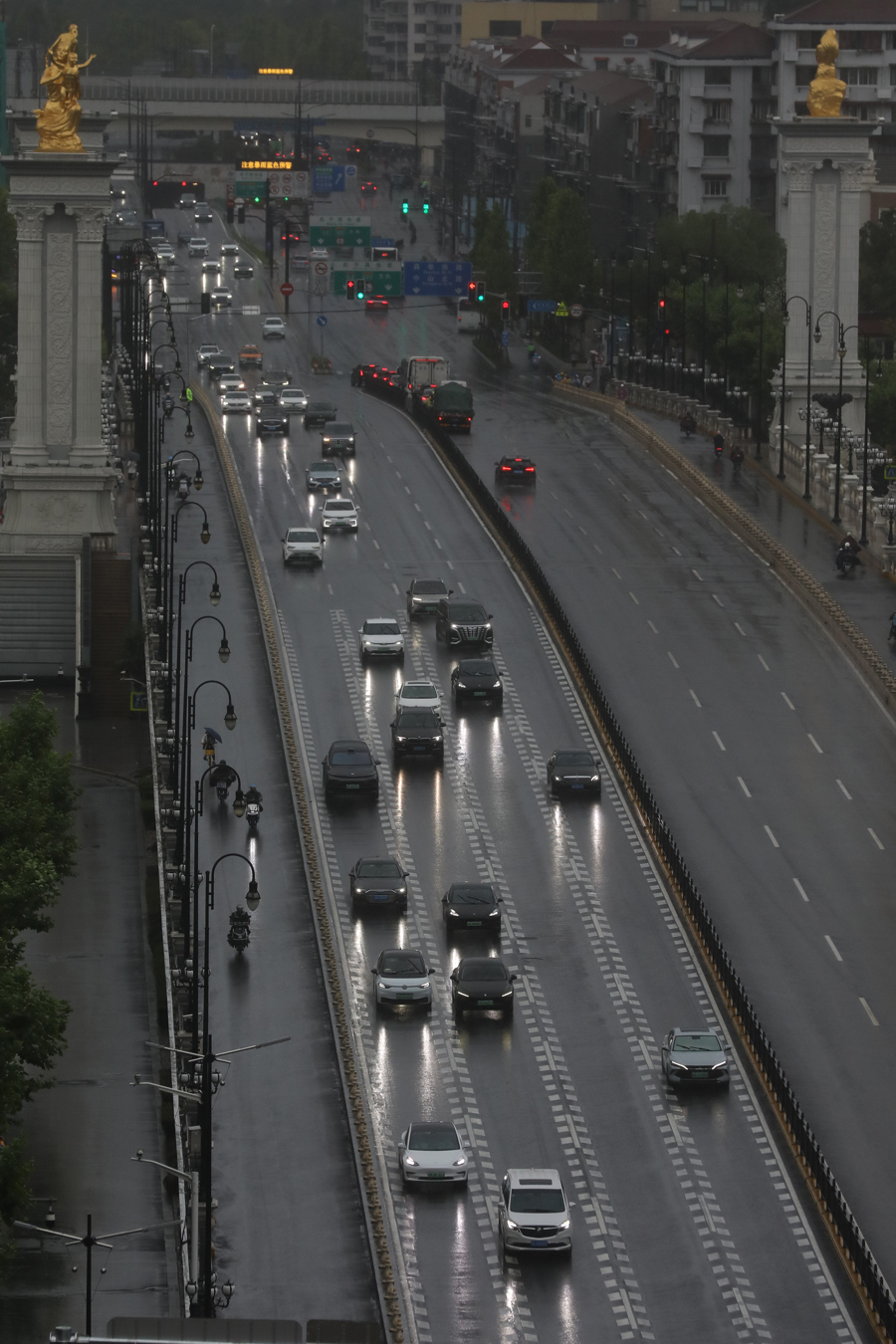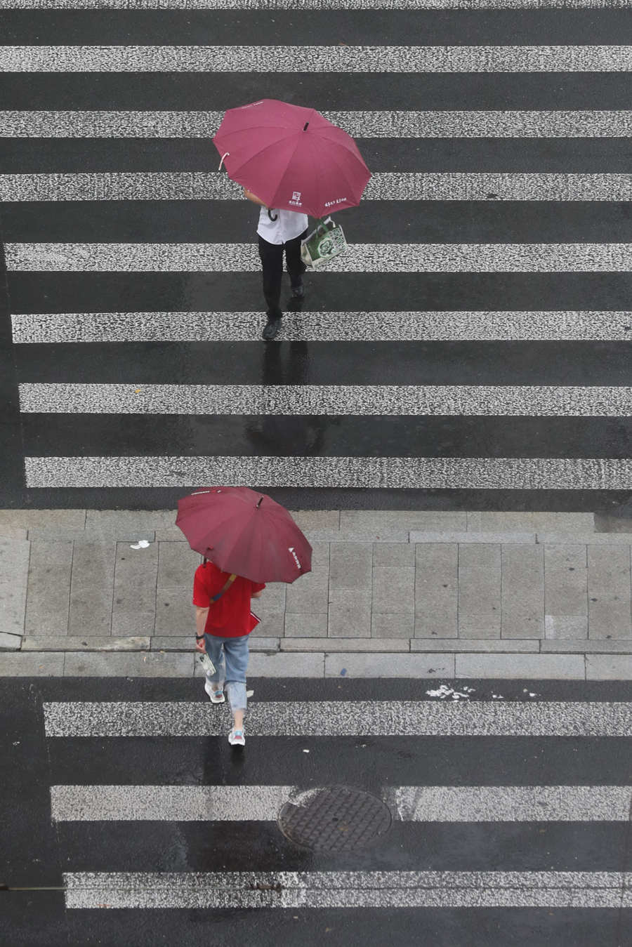 女孩雕塑的发尖和鼻尖也滴着雨珠。